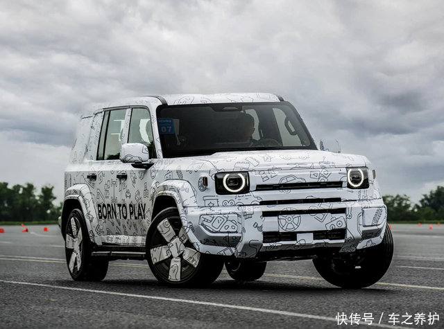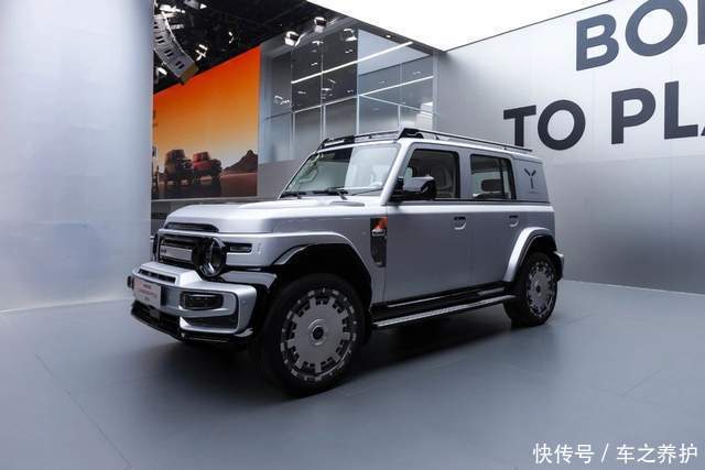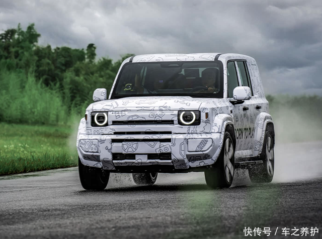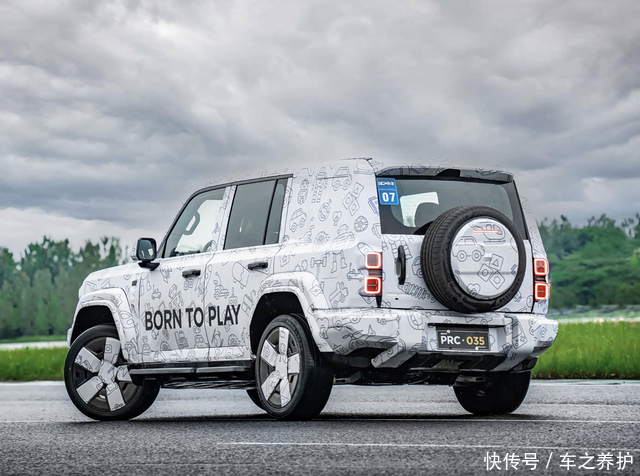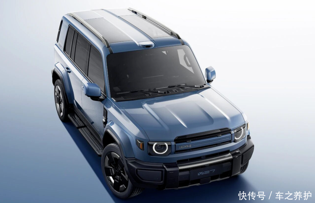 新车采用棱角分明的方盒子造型,前脸配备圆形 LED 日间行车灯与三条横向镂空格栅,搭配突出的银色防撞杠,将经典越野车元素与新能源时代审美巧妙融合。车身侧面的外凸轮眉、大尺寸轮毂及电动伸缩踏板强化了越野视觉属性,而悬浮式车顶设计则增添了一丝现代感。