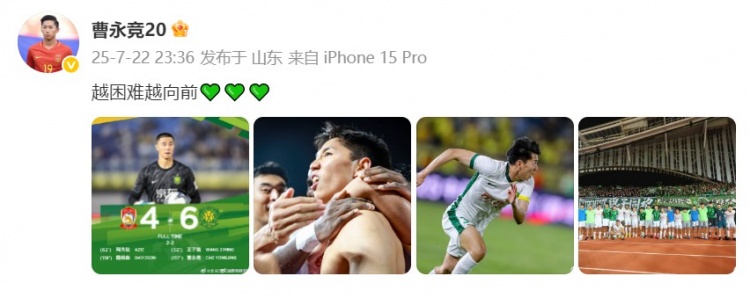 曹永竞在个人微博中写道:越困难越向前💚💚💚